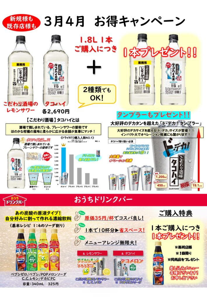 2026年3月3日 おすすめ商品【新規店様も!既存店様も!】3月4月お得なキャンペーン実施中! 前の記事フレッシュな香りと旨味【新酒第三弾入荷しました】次の記事 【3~5月限定】キリンビール晴れ風リニューアルキャンペーンのご案内